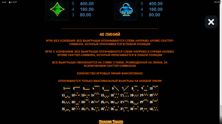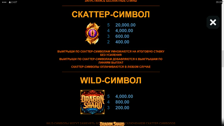 | Глаз дракона (Scatter) | 400 | 600 | 4000 | 20 000 |