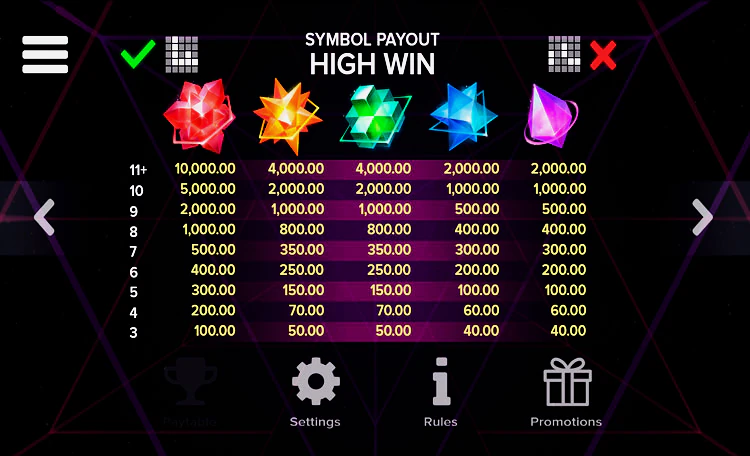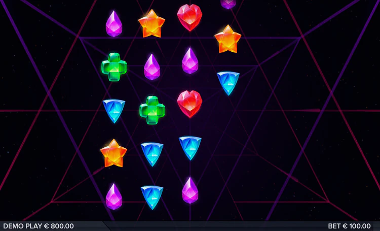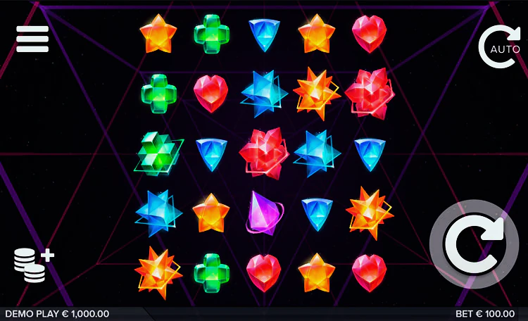 В видеослоте есть 10 базовых изображений. Они представлены геометрическими формами различных цветов — в виде капель, сердец, звезд и более сложных фигур. Отдельно стоит рассказать о спецсимволах: Wild — заменяет собой любые другие картинки, недостающие для построения оплачиваемой цепочки; Scatter – оплачивается независимо от своего расположения на поле.