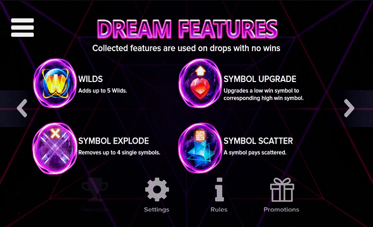 Поле игрового автомата разлиновано на 5 рядов по 5 барабанов на каждом. Здесь нет призовых линий. Оплачиваемые цепочки формируются по кластерному принципу: три и более одинаковых изображения должны располагаться рядом друг с другом по вертикали или горизонтали. Ставки принимаются на спин, при этом минимальная — $0,20, а максимальная — $100. Самый большой куш, который можно сорвать в Dreamzone составляет х2500 к одной ставке. В данном видеослоте нет традиционных фриспинов и джекпотов, зато есть другие бонусные функции, которые мы рассмотрим ниже.