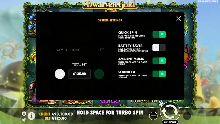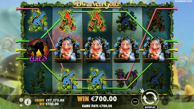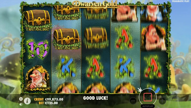 Символы на барабанах включают гномов, карточные номиналы, сундуки с сокровищами, скаттеры, а черный кот выступает в качестве дикого символа. Обычные вращения не имеют никаких модификаторов, а вот бонусные спины вводят общий множитель для увеличения выигрыша. Демоверсия слота Dwarven Gold позволяет игрокам познакомиться с оформлением аппарата, изучить расположение и механику призовых линий, понять общие правила автомата и совершить несколько пробных бесплатных вращений.