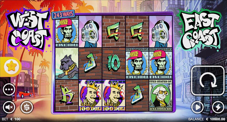 Как и в слоте xWays, игра East Coast Vs West Coast начинается с 243 и предлагает игрокам до 84 375 выигрышных вариантов. Чтобы получить выплату, нужно выпадение трех или более одинаковых символов на соседних барабанах слева направо, при этом самый щедрый приз — Бенджамин Франклин, в 7,5 раз превышает вашу ставку. Тем не менее, главный выигрыш в целом составляет колоссальные х30 618.