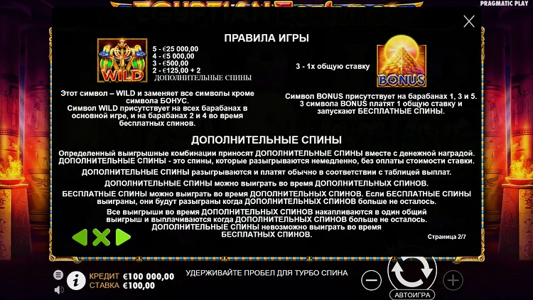 Чтобы активировать функцию фриспинов, вам нужно поймать символ пирамиды в любом месте на 1, 3 и 5 барабанах. После этого появится свиток, из которого будут выбраны три случайных символа. Это будут единственные символы на барабанах, за исключением вайлдов на 2 и 4 барабанах, что практически гарантирует несколько крупных выигрышей в раунде.