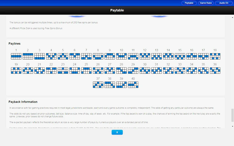 Призовой диск, расположенный в верхней части, вращается справа налево. Если на барабане выпадает символ Bonus (символ Bonus есть только на 1, 3 и 5 барабанах), то оплачивается символ на призовом диске, расположенном над этим барабаном.