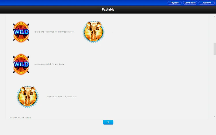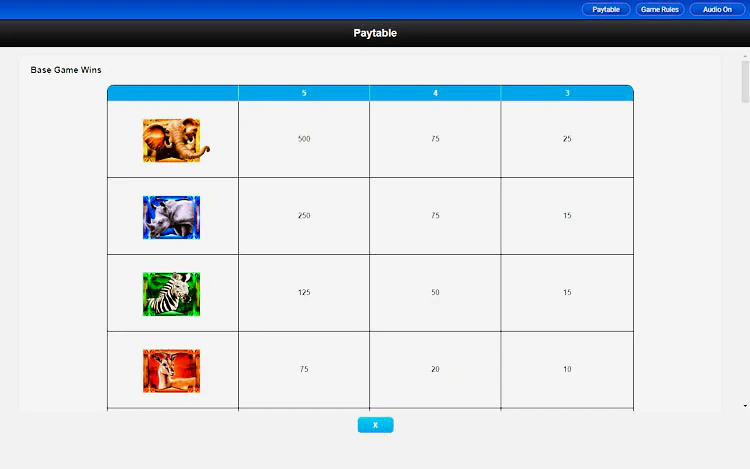 В игре представлены такие символы, как слоны, зебры, антилопы и носороги. Самым высокооплачиваемым символом является король слонов, который при совпадении пяти одинаковых символов умножает текущую ставку в 500 раз, а при совпадении 3 символов — в 25 раз.