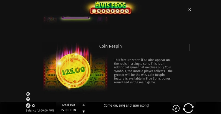 И, наконец, золотая монета дает шанс на один из трех фиксированных джекпотов. Чем больше монет вы соберете, тем выше ваши шансы выиграть значительное вознаграждение. Если удача окажется к вам благосклонна, Элвис Фрог исполнит в вашу честь особенную мелодию.
