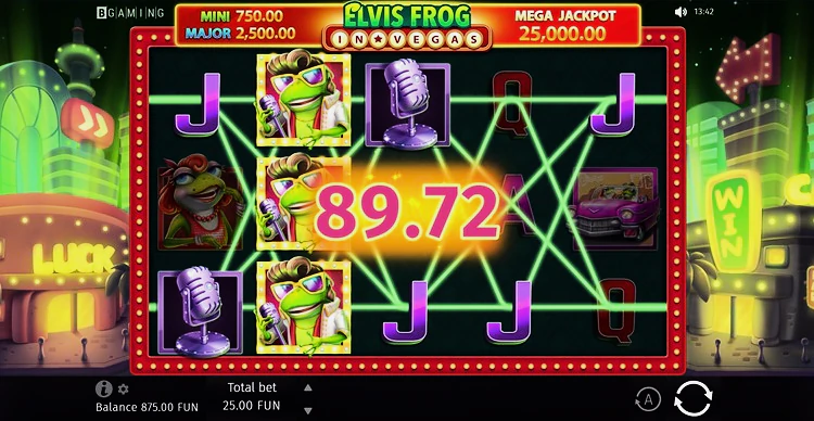 Компания BGaming выпустила очередной захватывающий слот Elvis the Frog in Vegas с классической раскладкой 5×3 и 25-ю линиями, а максимальный выигрыш составляет 2.500х. Этот слот рассчитан как на хайроллеров, так и на тех, у кого ограниченный бюджет для игры.