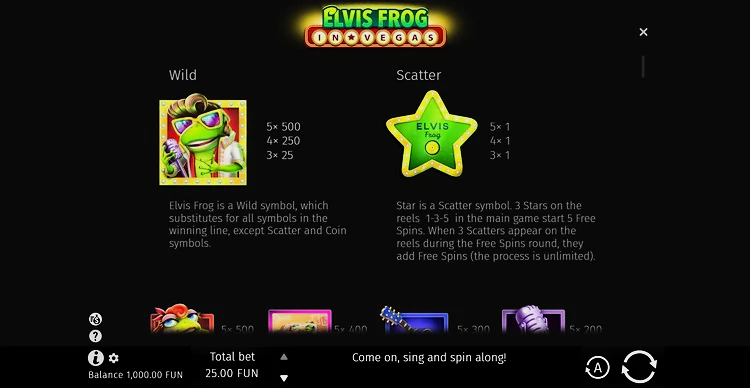 Elvis Frog in Vegas отдает дань уважения легендарному королю рок-н-ролла. Тематические символы игры не только отличаются изысканным дизайном, но и демонстрируют прочную связь с миром музыки и Лас-Вегасом, где Элвис Пресли когда-то давал живые выступления. Во время игры вам будут встречаться такие символы, как классический микрофон, роскошный розовый автомобиль и сам Элвис Фрог в культовом одеянии певца.