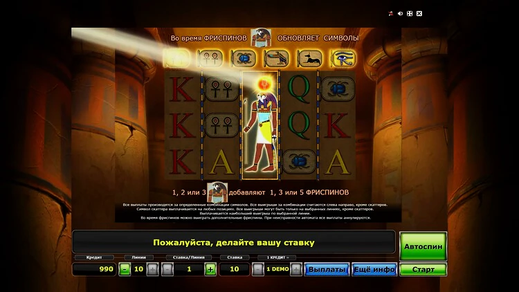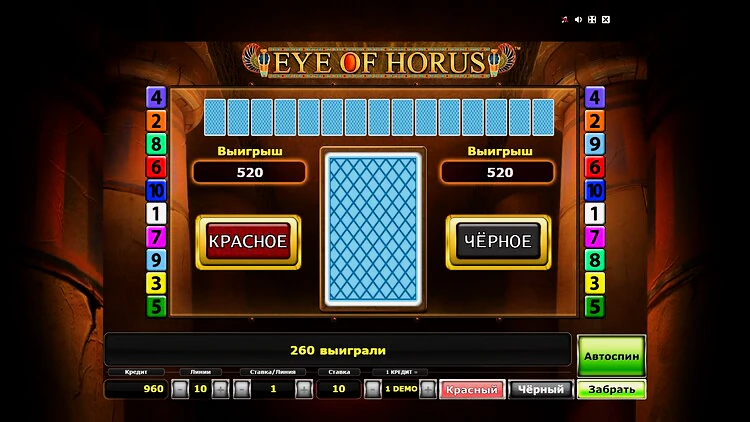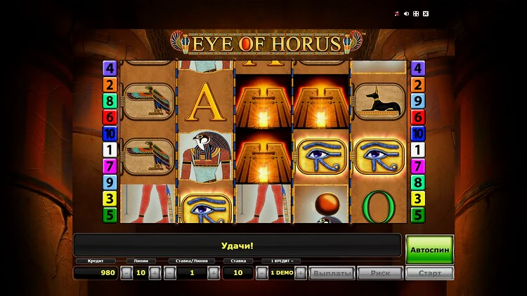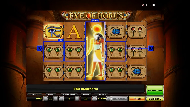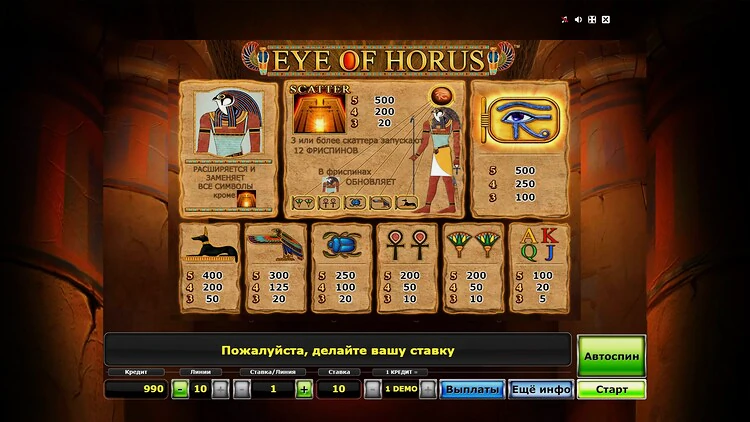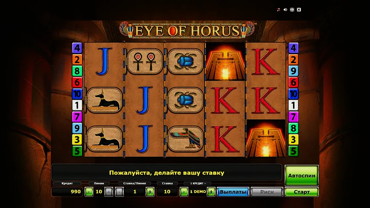 Играть в слот Eye of Horus легко и просто. В игре 5 барабанов и 10 линий выплат. Перед началом просто установите размер ставки и начинайте вращать барабаны. Кроме того, доступна очень полезная функция автоматической игры, позволяющая установить количество спинов для автоматического воспроизведения. Вы можете изменять размер ставки на линию, выбирая кнопки плюс и минус, чтобы увеличить или уменьшить размер ставки. Ставка указана на одну линию.