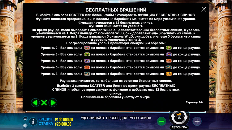 Скаттеры в количестве более трех на экране одновременно приносят бесплатные вращения в количестве двенадцати штук, а с каждым новым уровнем игры это число увеличивается.