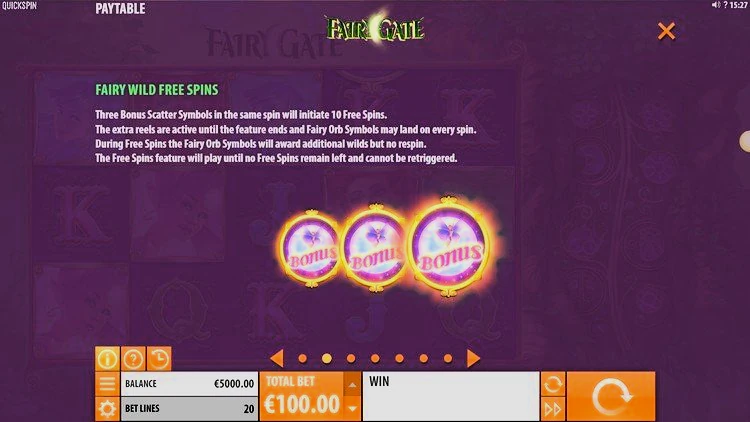 Когда на барабанах появятся три бонусных символа, вы получите 10 бесплатных вращений. Во время этого раунда ворота фей остаются открытыми, позволяя феям продолжать свой путь в лес и даря вам повторные спины по пути. Таким образом, повторные спины в рамках бесплатных вращений в этой игре обеспечивают щедрый выигрышный потенциал.