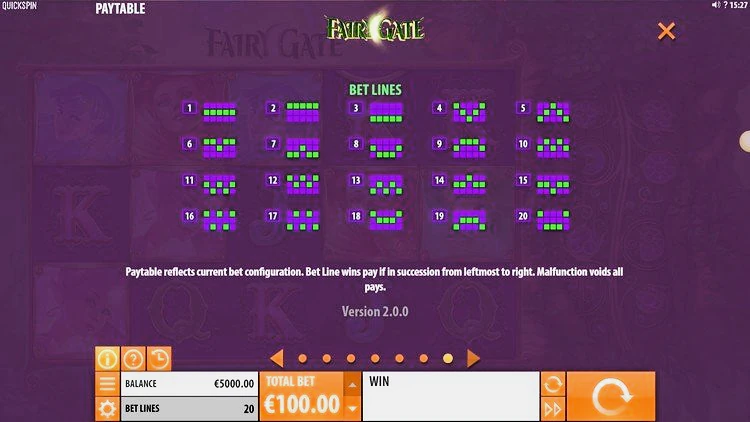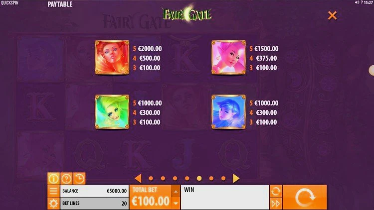 В Fairy Gate 20 линий выплат, а ставки фиксированные. Это означает, что вы не можете поставить меньше, чем на 20 линий, но это гарантирует, что вы никогда не упустите выигрышную возможность. Как и во всех других слотах Quickspin, здесь есть широкий диапазон ставок, так что и хайроллеры, и игроки в копеечные слоты с удовольствием попробуют сыграть в Fairy Gate.