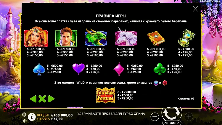 Слот Fairytale Fortune был создан известной студией Pragmatic Play более пяти лет назад, в 2018 году. Он выполнен в стиле романтических сказок и включает в себя таких персонажей, как принц, принцесса, дракон и единорог. Этот слот не только визуально очень привлекателен, но и предлагает интересный набор бонусов. Здесь есть четыре бонусные игры, которые случайным образом активируются при появлении трех скаттеров. После каждого бонусного раунда у игроков есть возможность сыграть в риск игру и увеличить свой выигрыш в 2-5 раз.