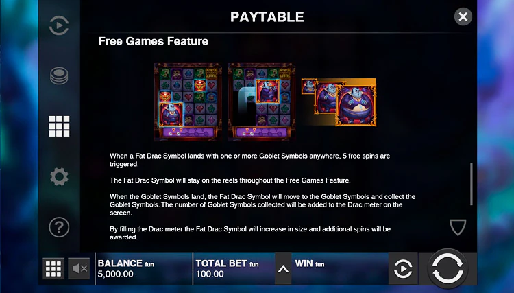 Раунд бесплатных вращений Fat Drac запускается, когда выпадет 1 или более символов кубка одновременно с самим Fat Drac. Вы получаете пять бесплатных вращений. В бонусном слоте Fat Drac от Push Gaming вы найдете функцию the walking, colossal wild. Толстяку Драку нужны символы кубка, и он будет пробираться по барабанам, чтобы сожрать их. По мере того, как он будет это делать, он будет расти и поможет вам гораздо легче получать выигрыши.