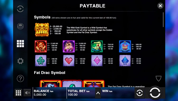 Коэффициент RTP Fat Drac является переменным, поэтому он может варьироваться от 90,49% до 96,57%. Мы всегда советуем узнавать точный процент выплат в любых игровых автоматах с изменяющимися коэффициентами, в которые вы планируете сыграть на реальные деньги. Хорошей новостью является то, что RTP высшего уровня (96,57%) выше, чем у Fat Santa и Fat Rabbit (96,45%).