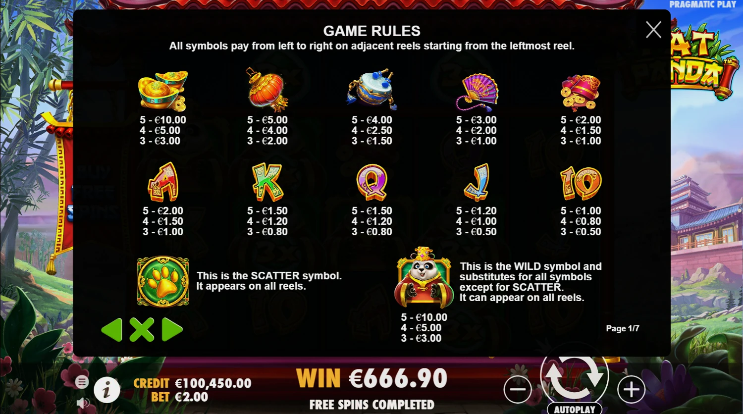 Игровой автомат Fat Panda вдохновлен восточной культурой, включая элементы из Китая и символику панд. Накануне выхода мультифильма «Кунг-Фу Панда», этот слот вновь набирает популярность в онлайн казино. Игроки выбирают его, благодаря понятному геймплею и подъемной стоимости спина, которая меняется от 0,10 до 100 монет. Управлять ценой за спин можно прямо в центральном меню. Также в этом слоте Pragmatic Play решил повысить потенциал выигрыша до 20.000х к первоначальной ставке.