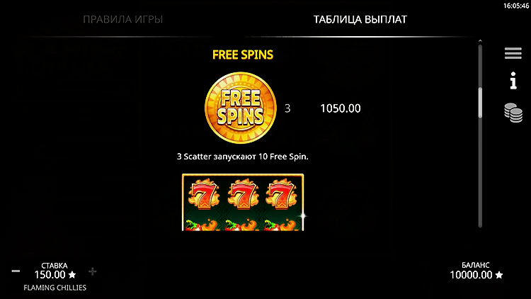 При выпадении трех скаттеров активируется бонусный раунд бесплатных вращений в слоте Flaming Chillies. Во время этих вращений сохраняется первоначальная ставка, а бонус может быть повторно запущен при выпадении еще трех скаттеров во время этого раунда.