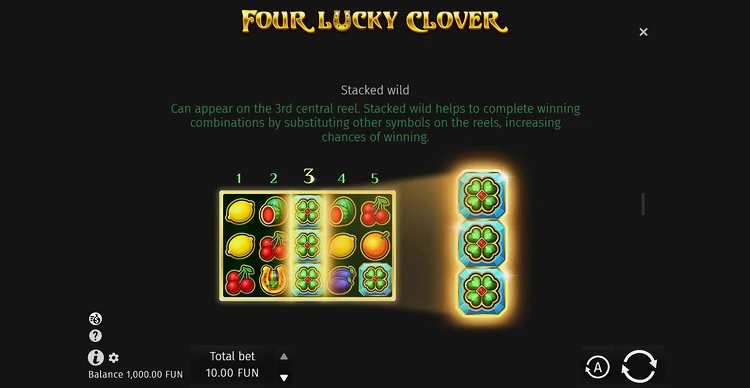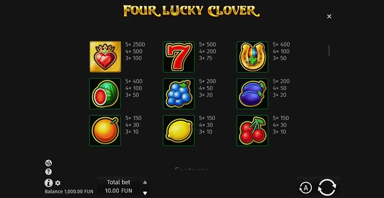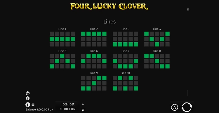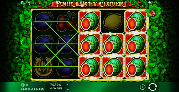 Игровой процесс Four Lucky Clover построен на классической схеме. На сетке 5х3 можно найти 10 активных линий. Пользователям нужно собирать комбинации из 3 и больше одинаковых картинок для формирования призовых комбинаций. При этом есть дополнительная функция, которая может случайно активироваться во время базовых вращений.