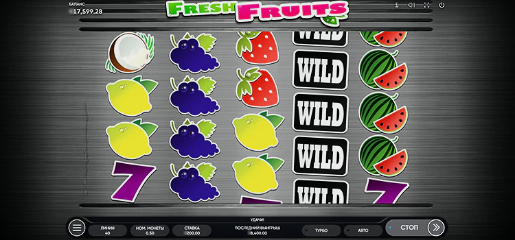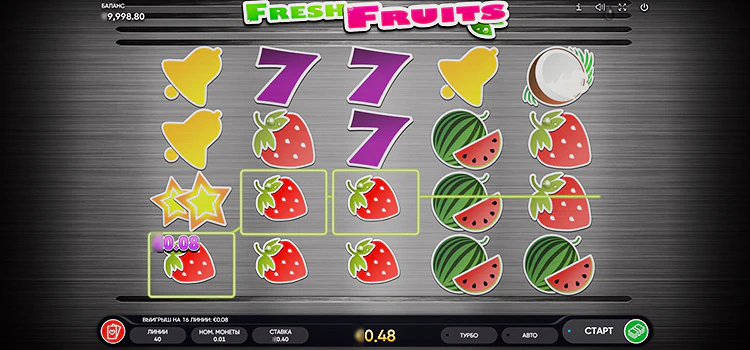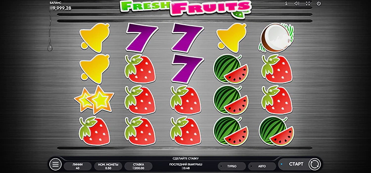 Fresh Fruits — игровой автомат в классическом стиле, основанный на символах «одноруких бандитов». Однако, эта игра представляет собой свежее обновление:, с фоном в стиле матового алюминия и четко прорисованными символами. Во время вращения барабанов, в отличие от многих игр, не просматривается попытка имитировать реальный игровой автомат.