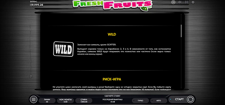 Долгосрочный RTP Fresh Fruits составляет 96%. Endorphina создала эту игру со средней дисперсией, обеспечивая сбалансированный игровой процесс при вращении барабанов. То есть, уровень выигрышей и проигрышей находится примерно в одном процентном соотношении.