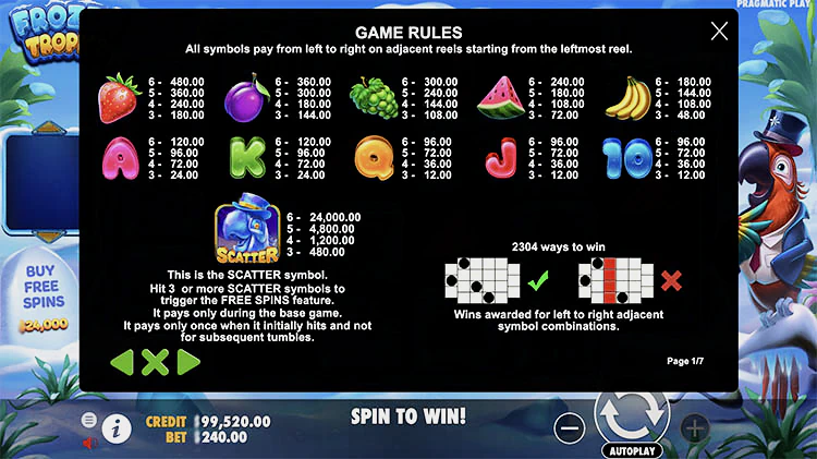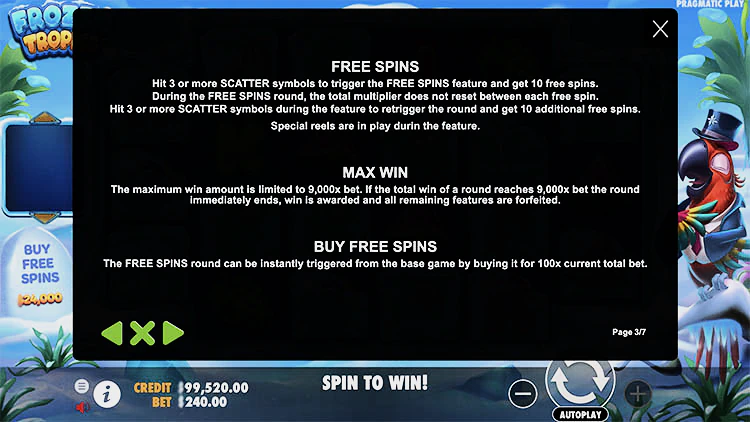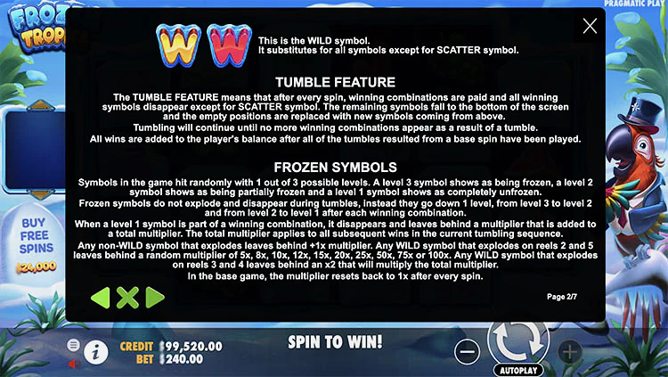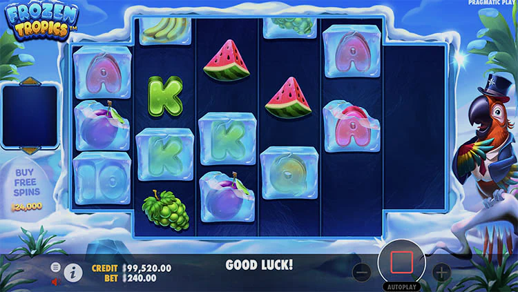Кроме этого, в Frozen Tropics есть классические для видео слотов wild и Scatter, которые могут заменять любые другие и умножать комбо или запускать бонус раунд с фриспинами. Предусмотрен демо-режим и функция авто вращения. Если игрок не хочет полагаться на удачу и дожидаться открытия бонусного раунда, есть функция его покупки.