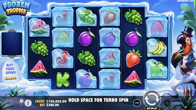 Видео слот Frozen Tropics от Pragmatic Play — это игровой автомат с механикой замораживающихся символов, наподобие Keep’em Cool. Замороженные фигуры остаются на экране, и могут многократно участвовать в выигрышных комбинациях, увеличивая текущий множитель.