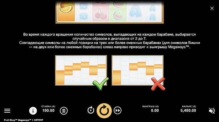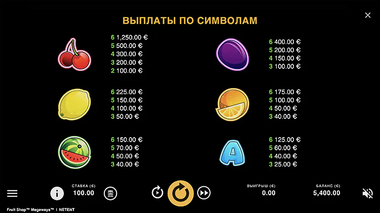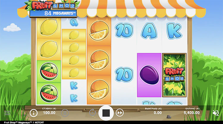 RTP (возврат игроку) Fruit Shop Megaways составляет 96,06%. Это также слот с высокой дисперсией, который предлагает главный приз в размере 10 000 раз.