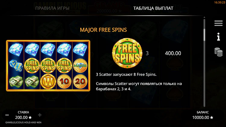 Ставка по умолчанию при запуске игрового автомата Gamblelicious Hold and Win составляет 1,50 доллара за спин. Настройте ее по своему вкусу и нажмите кнопку Spin, чтобы начать игру. В качестве альтернативы вы можете использовать функцию автозапуска, чтобы вращать его автоматически. Все вращается вокруг функции Hold & Win, но есть несколько примечательных упоминаний, прежде чем вы дойдете до нее.