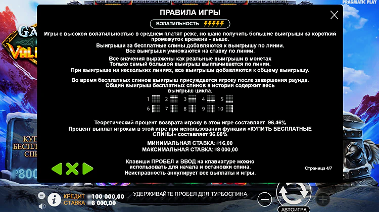 The Gates of Valhalla — игровой автомат со средней отдачей и низким преимуществом казино. RTP, официально представленный провайдером, составляет 96,5%. Комбо считывается с лево направо. Минимальная ставка в игре 20 центов. Максимальная поднимается до ста долларов.