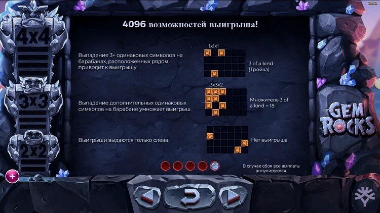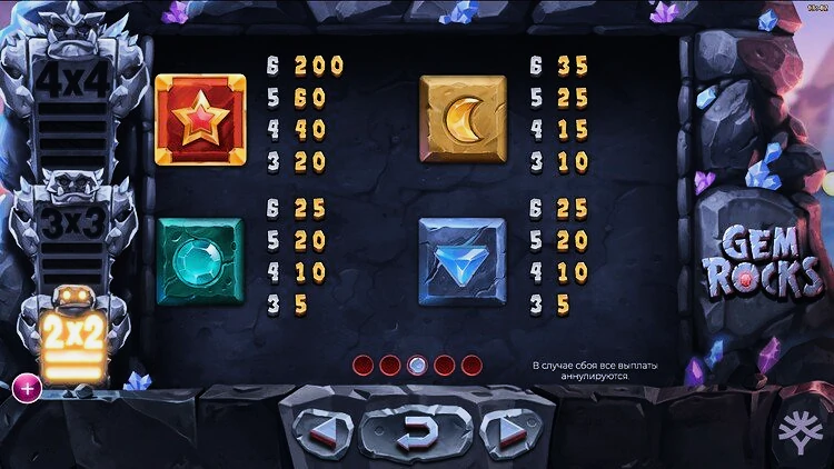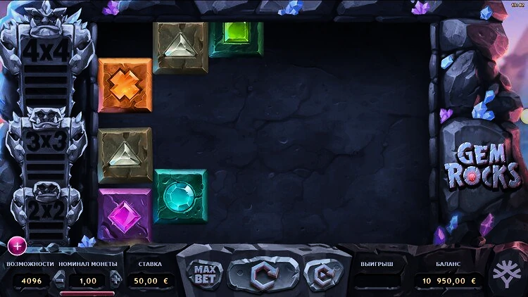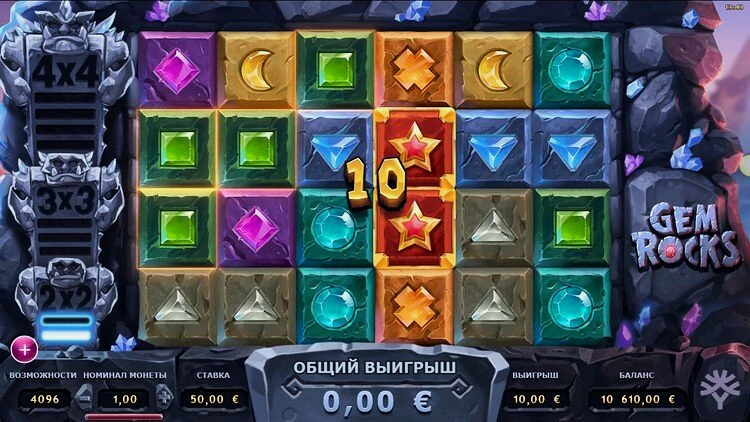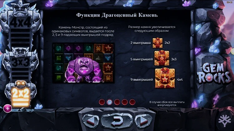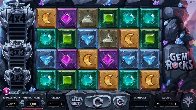 Главный атрибут слота Gem Rock — это особенность, которая отличает эту игру от других подобных аппаратов. Эта уникальная функция запускается после того, как игроки получат 2, 5 или 9 последовательных каскадных выигрышей, что является значительным достижением. После активации на барабаны опускается один драгоценный камень, состоящий из одинаковых символов. Его размер увеличивается с ростом количества выигрышей подряд. Он достигает впечатляющего размера 4х4 символа, когда игроки получают 9 выигрышей подряд.