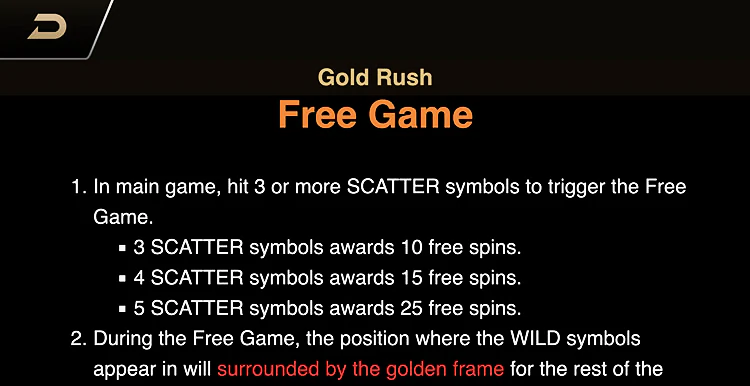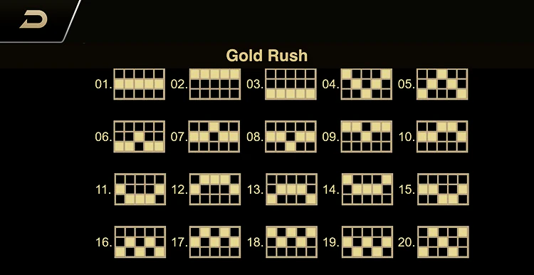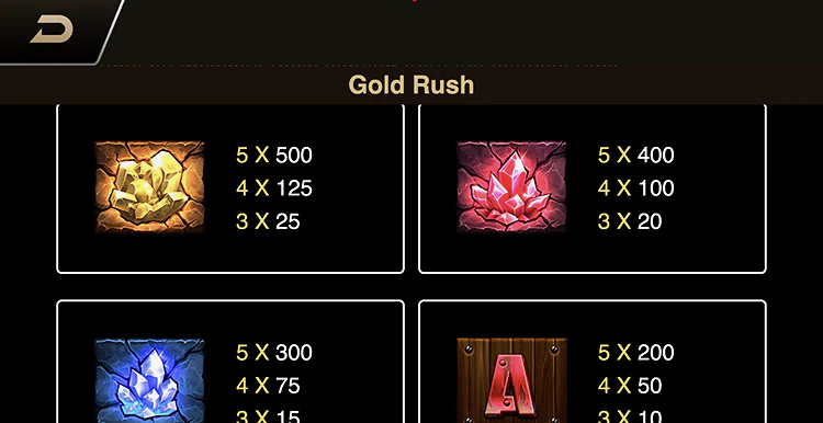 Цель игры Gold Rush — поймать три или более одинаковых символа на одной из двадцати пяти линий выплат. Первый символ комбинации должен появиться на крайнем левом барабане, а как минимум два других символа на втором и третьем барабанах соответственно, следуя обозначенной структуре линий выплат. Дикий символ динамит может заменить все остальные символы, кроме скаттера, увеличивая ваши шансы на получение больших выплат по ходу игры.