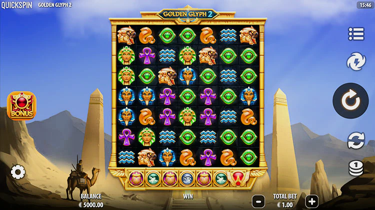 Игра выполнена в ярких, почти неоновых тонах с детализированными символами, создающими яркий эстетический вид, который наверняка понравится игрокам. Играя на деньги или бесплатно в онлайн слот Golden Glyph 2, игроки видят залитую светом сетку 7×7 в вади рядом с привлекательным видом на колонны, скалы и просторный храм. На переднем плане изображен парень на верблюде с винтовкой, предположительно охраняющий храм, который игроки планируют разграбить.