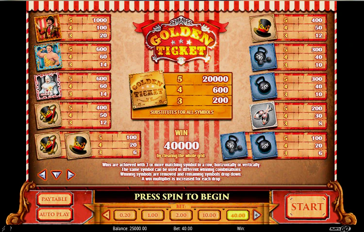 Golden Ticket — это онлайн-слот, созданный Play’n GO, в который играют по сетке 5х5. Чтобы выиграть деньги, нужно собрать в ряд от трех до пяти символов. Также есть раунд бесплатных вращений с дополнительными бонусами. В обзоре подробнее рассмотрим все плюсы автомата.
