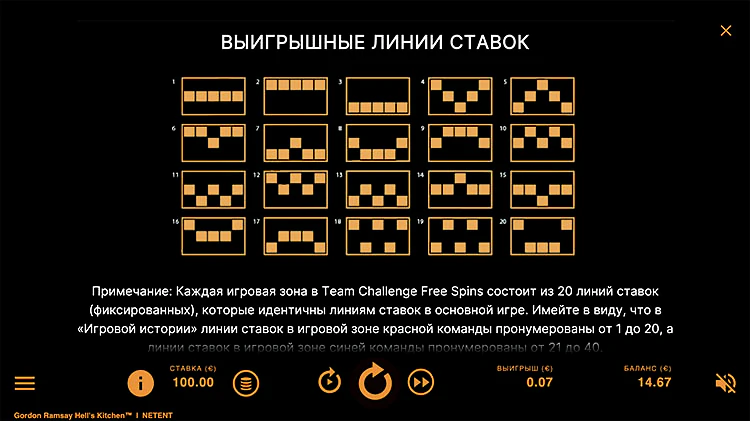 В онлайн-слоте Hell’s Kitchen от NetEnt есть 20 линий выплат. Чтобы получить выигрыш, вам нужно выпадение трех или более одинаковых символов на любой из игровых линий. Самым щедрым символом в игровом автомате является говядина по-веллингтонски, которая выплачивает 10-кратный уникальный выигрыш.