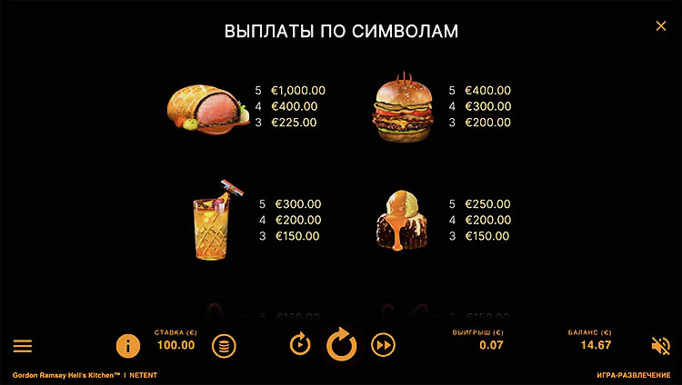 Gordon Ramsay’s Hell’s Kitchen — онлайн-слот с 20 линиями выплат, разработанный NetEnt. Особенности включают бесплатные вращения, несколько наборов барабанов, бонус за выбор приза и множители wild. Коэффициент доходности этого слота с низкой волатильностью составляет 96,07%, а его главный приз составляет х1000.