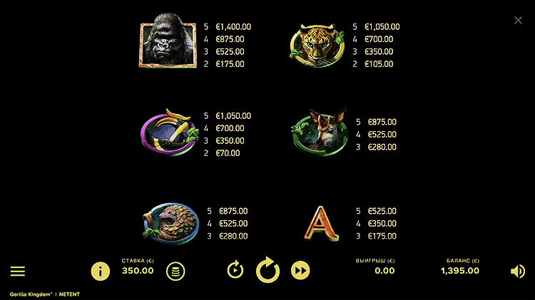 Gorilla Kingdom от NetEnt — это онлайн-слот с 1024 вариантами выигрыша, и игроки могут ставить от 0,10 до 200 монет за спин. В меню автозапуска вы можете установить лимиты проигрыша и выигрыша, а в меню настроек вы можете переключать способ отображения вашей ставки (наличные или монеты) или включить опцию быстрого вращения (которую также можно включить, нажимая стрелки справа от кнопки воспроизведения).