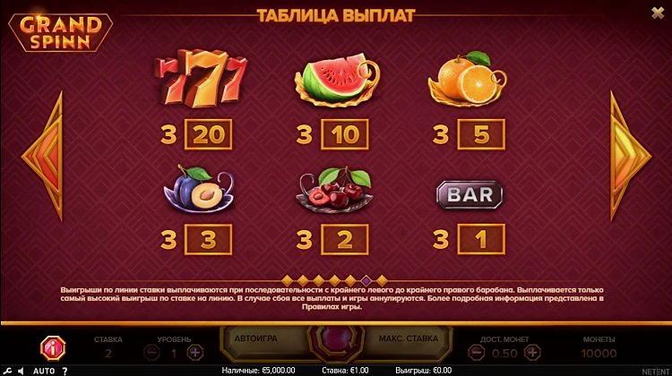 Когда вы вращаете барабаны Grand Spinn, вам предлагаются очень щедрые выплаты. Самым прибыльным символом в игре является тройная семерка, которая предлагает приз в 20 раз больше вашей ставки. Хотя может показаться, что это не так уж и много, есть и другие бонусы, которые обеспечат вам дополнительные выплаты.