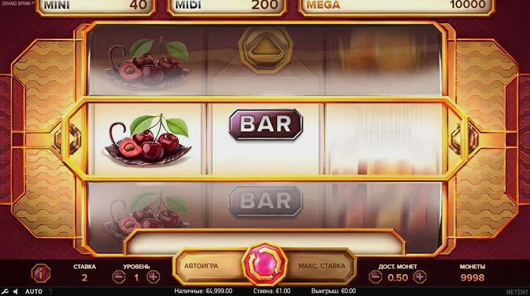 Функция Nudge — это главный бонус, предлагаемый в Grand Spinn. Каждый раз, когда выпадает выигрышная комбинация, следите за средним барабаном. Если символ совпадет с выигрышной комбинацией, он подтолкнет ее на место, и вы получите еще одну выплату. Так продолжается до тех пор, пока не останется ни одного совпадения.