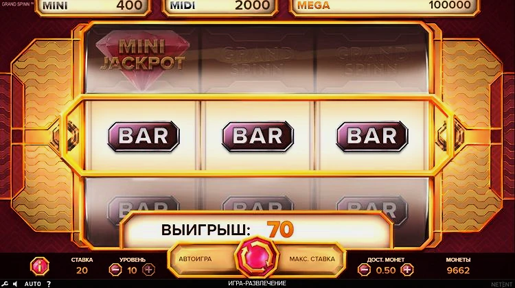 Grand Spinn от NetEnt — это слот в классическом стиле с тремя барабанами и тремя линиями выплат, поэтому игровой процесс довольно прост. Игрокам предлагается диапазон ставок от 20 монет до 200 монет, что должно понравиться как хайроллерам, так и игрокам с более скромным бюджетом.