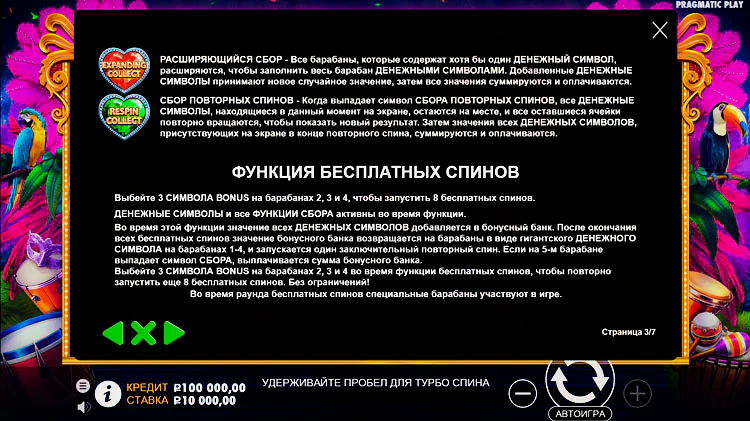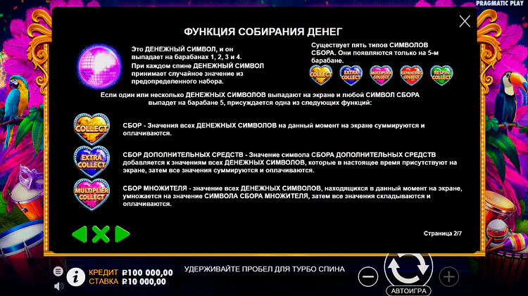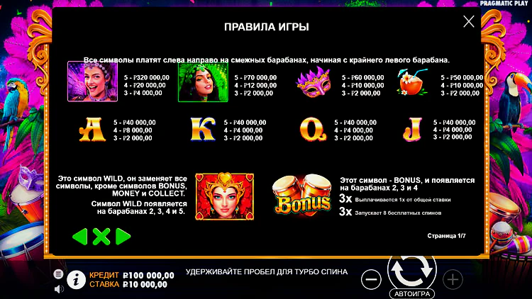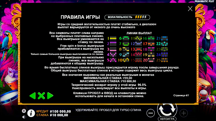 Стандартное игровое поле 3х5 – идеальный формат игры. Сетка включает в себя 25 линий. Pragmatic Play установил стандартный диапазон отдачи для нового слота Heart of Rio. Он составляет 96,5%. Общий множитель можно поднять до 32х.
