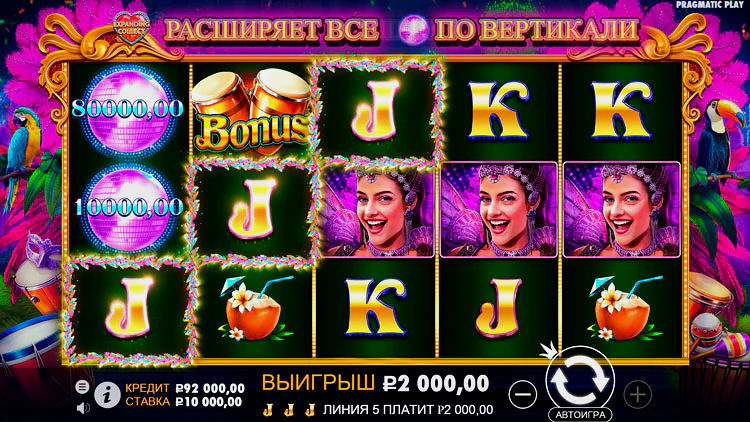 Heart of Rio – видеослот, который полностью отражает атмосферу солнечной Бразилии, даже если вы никогда в ней не были! Пристегните ремни, мы взлетаем и отправляемся на карнавал! Но, даже не думайте о возможности расслабиться! Pragmatic Play подготовил настолько обширную бонусную программу, что вам будет некогда отдыхать – все ваше внимание будет сосредоточено на возможности заработать!