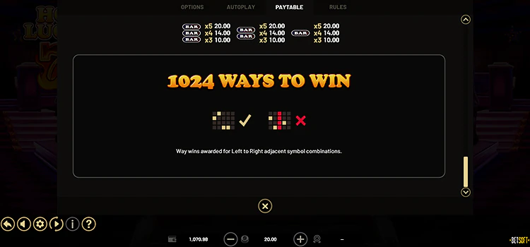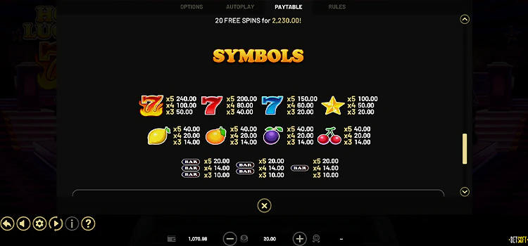 Играть в игровой аппарат Hot Lucky 7’s в деморежиме и на деньги просто. С помощью кнопок «+» и «-» нужно изменить размер ставки диапазон варьируется от 0,10 до 22 кредитов. Большая кнопка справа запускает игу. Можно воспользоваться автозапуском. Игроки могут активировать фриспины, купив бонусную функцию, нажав на символ корзины и выполнив указания.
