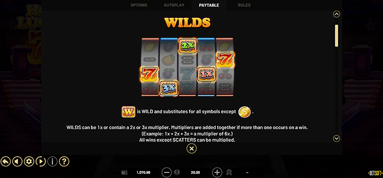 Кроме обычных символов в слоте Hot Lucky 7’s есть wild – значок с одноименной надписью и scatter – монета с изображением доллара. Их выпадение позволяет получить бонусы и джекпот. Дикий заменяет все символы на барабане, но максимальная отдача ждет игроков при его выпадении в раунде бесплатных вращений.