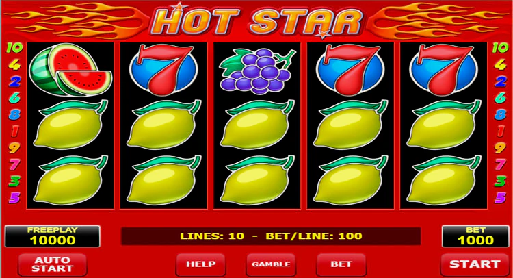 Hot Star отличается потрясающей графикой и красиво оформленными символам, которые включают такие фрукты и ягоды, как арбузы, сливы, вишни, апельсины, лимоны и семерки. Выплаты варьируются от 250 монет за три вишни до 12.500 монет за линию из пяти семерок.