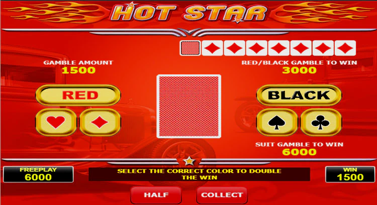Как и другие игры от Аматика, Hot Star включает в себя риск-игру. После каждого удачного спина игрок может увеличить выигрыш в раунде на удвоение. При активации игры появляется новое игровое поле, на котором изображена мигающая перевернутая карта.