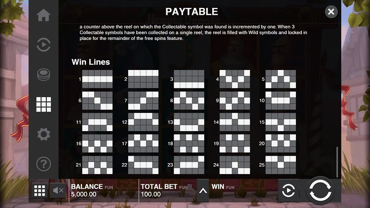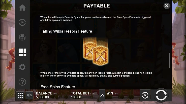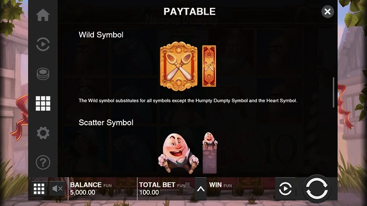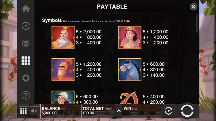 Игровой слот в бесплатном онлайн режиме Humpty Dumpty обладает полем, состоящим из 5 барабанов, 3 рядов и 25 линий выплат. Минимальная ставка составляет 0,25, а максимальная — 100. Игроки могут рассчитывать на RTP в размере 96,61% и среднюю волатильность. Поэтому слот подходит для отыгрышей бонусов в онлайн казино. Максимальный выигрыш в этом средневековом городке в 3000 раз превышает ставку.