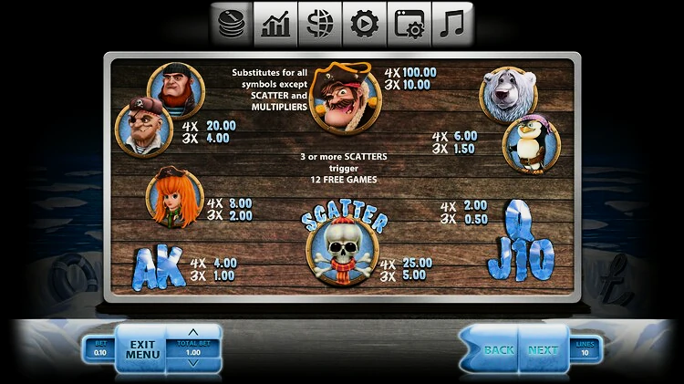 Затем переходим к рыжеволосой девушке-пирату, пингвину и Белому медведю. За двумя членами пиратской команды следуют дополнительные шансы на крупный выигрыш. Запускаются бесплатные вращения, где есть шанс увеличить приз минимум в два раза.