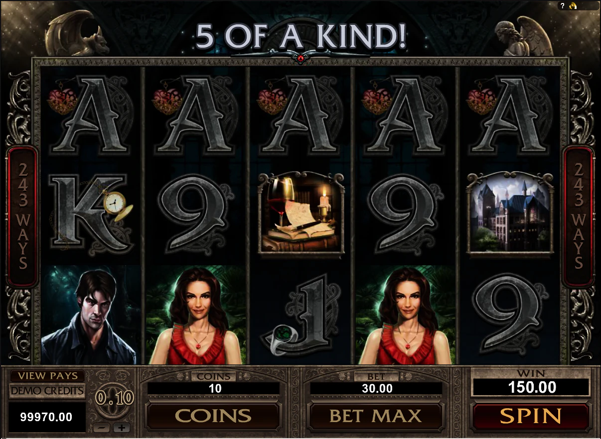 Immortal Romance хорош тем, что игрокам не нужно самостоятельно устанавливать количество линий выплат, так как в игре есть 243 способа выиграть, и выплата производится в обе стороны. Для регулировки ставки можно воспользоваться кнопкой -/+ в нижней части дисплея слота.