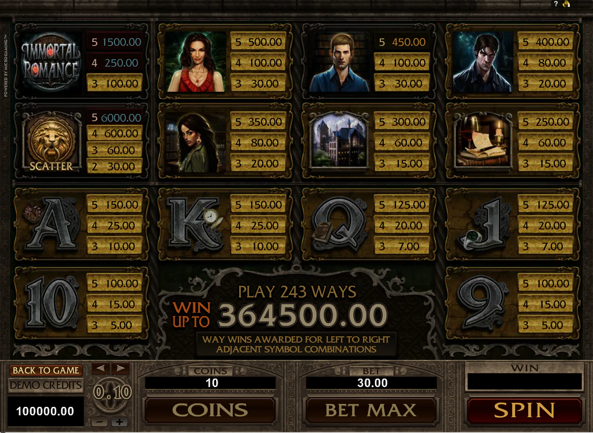 Слот Immortal Romance отправит вас в опасное приключение, тема которого — запретная любовь, когда герои влюблены друг в друга, но не могут быть вместе. Immortal Romance от Microgaming— это 5-барабанный слот с 3 рядами и 243 способами выигрыша, скаттерами, вайлдами и бесплатными вращениями.