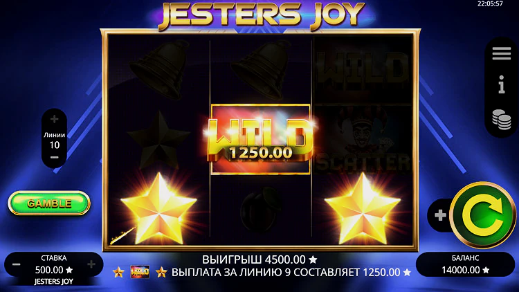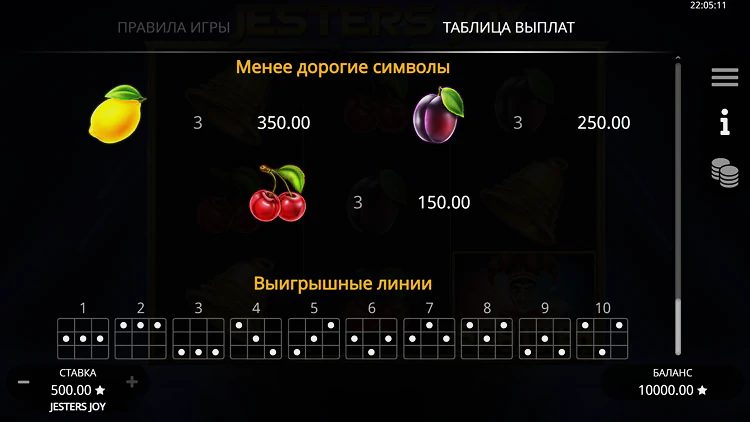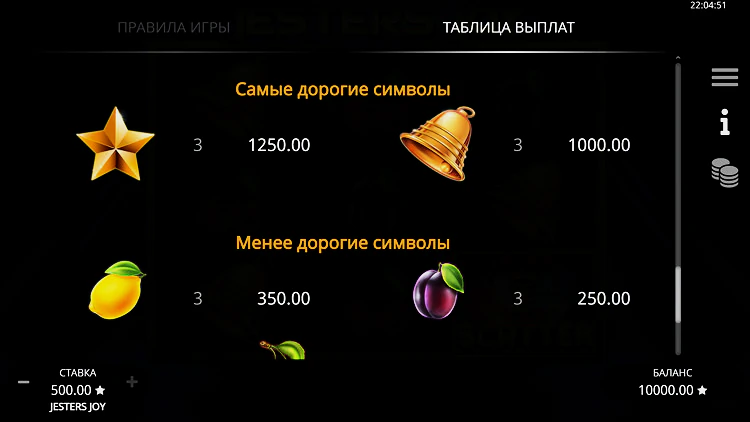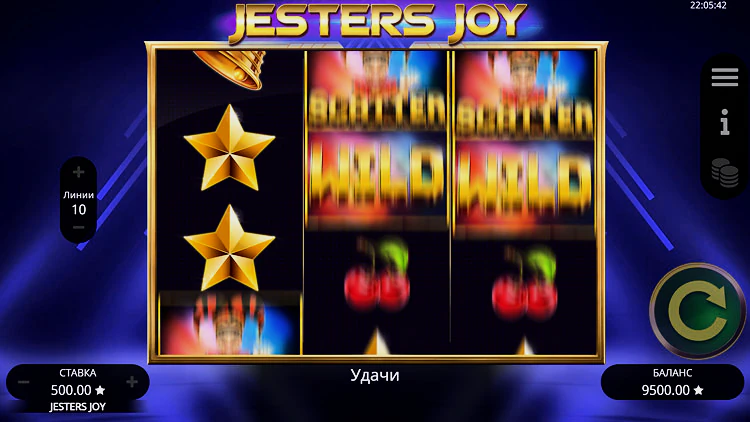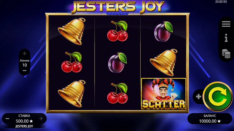 Jesters Joy отличается интересным ретро дизайном, напоминающим классические слоты, и понравится тем, кто любит игры такого типа. Jesters Joy имеет поле с тремя барабанами, тремя рядами и предлагает до 10 линий выплат. Игроки могут выбрать количество линий выплат, которые они хотят активировать, прежде чем сделать ставку.
