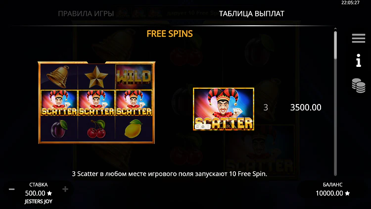 Теперь немного о бонусах игрового автомата Jesters Joy. Появление на трех барабанах шутов, представленных тремя скаттерами, активирует функцию бесплатных вращений.